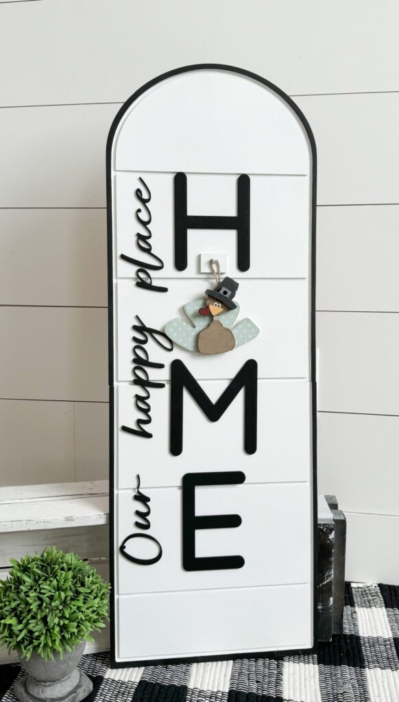 • White vinyl – Eyes – Eyebrows (stencil) – “Happy Thanksgiving” (reverse stencil)